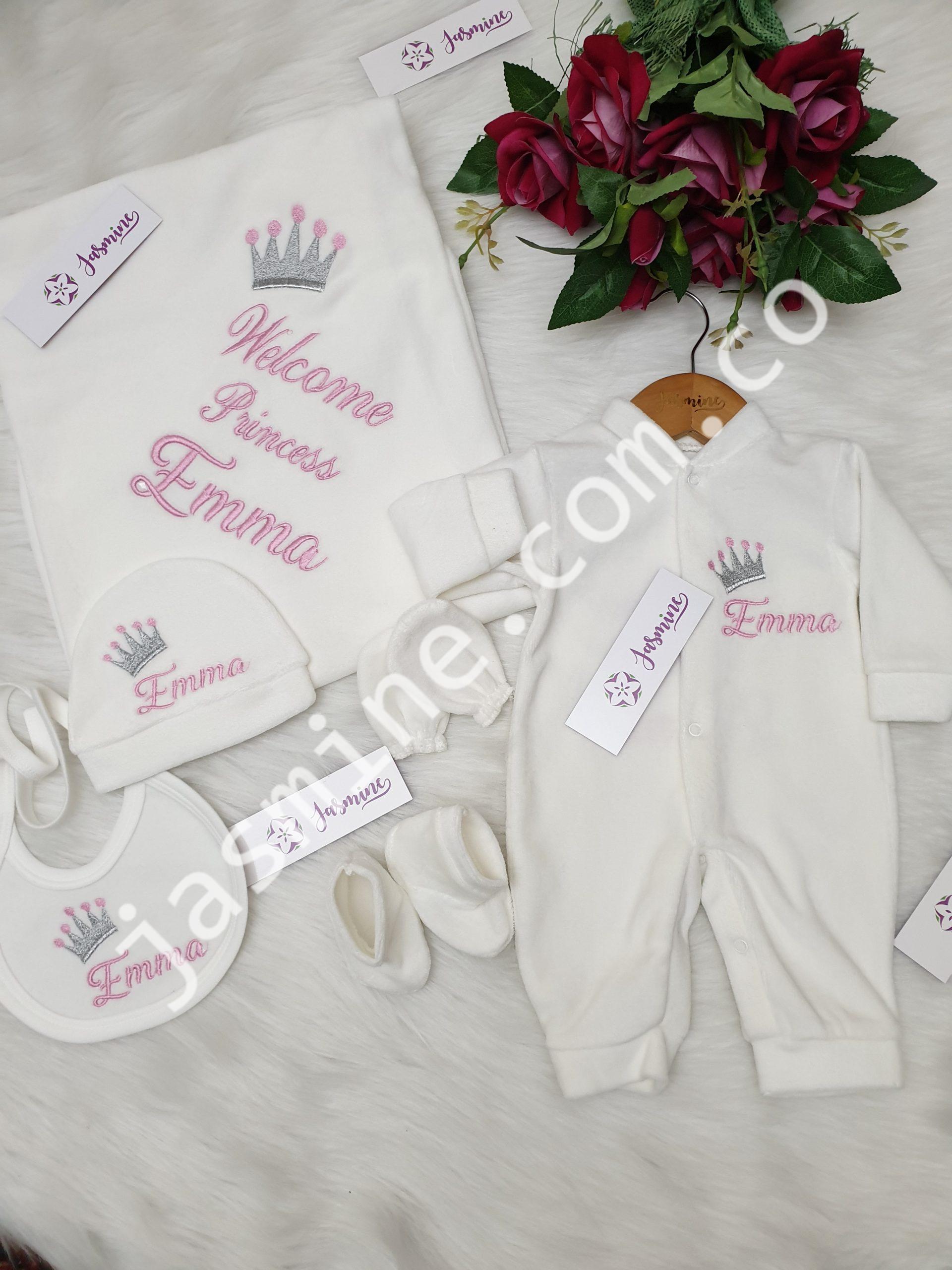 طقم سبوع وولادة ٦ قطع تطريز باسم إيما Emma