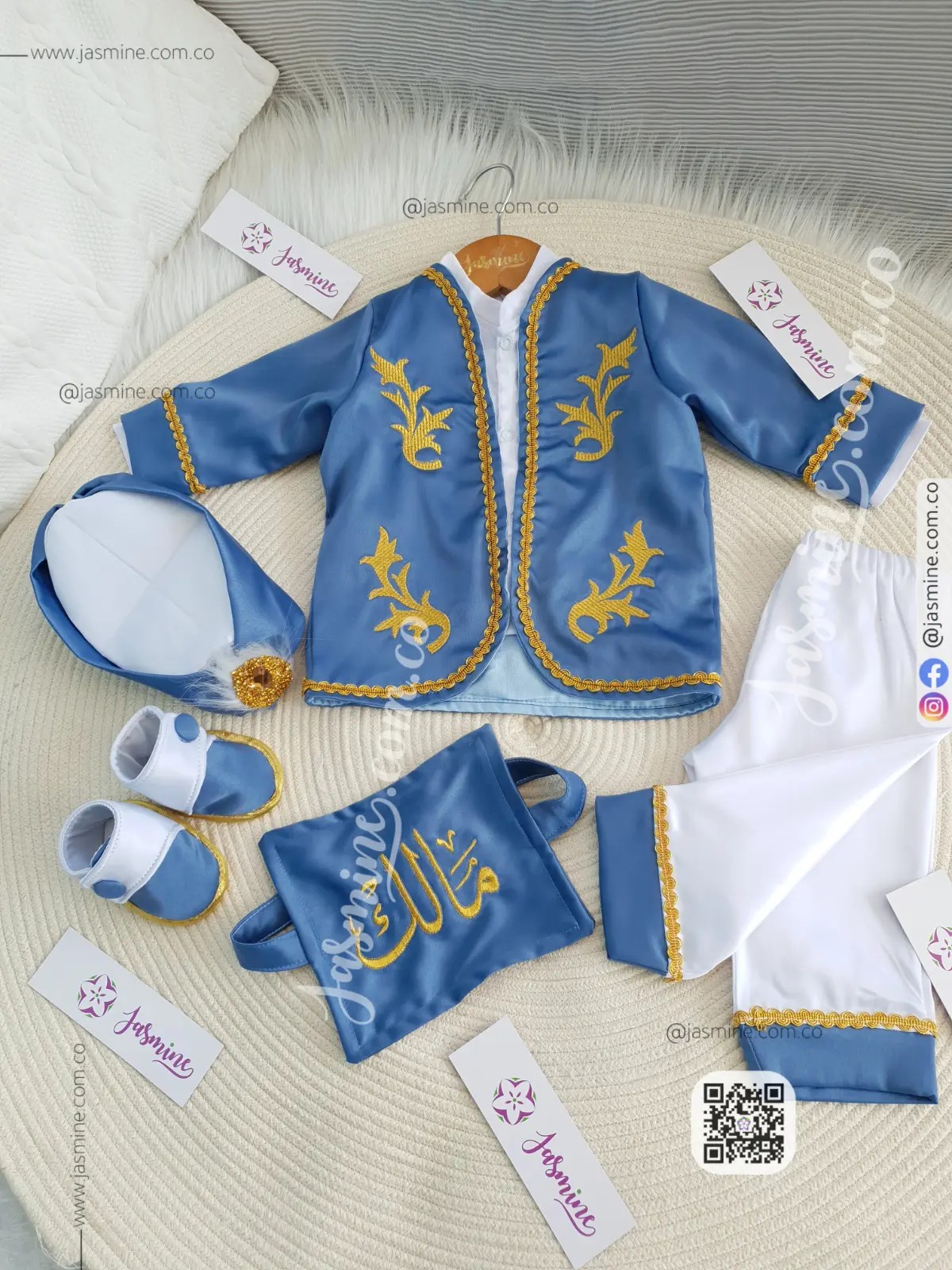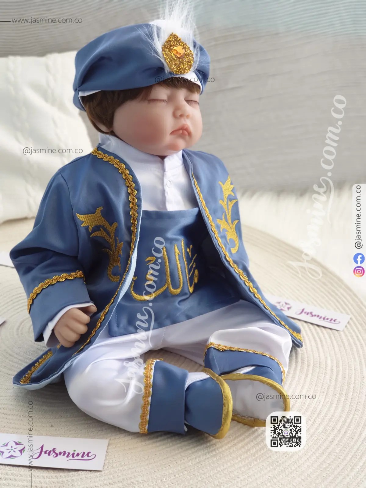 بدلة السلطان مع شوز ذهبي (6 قطع) لون كحلي منور مُصنع بالاسم تصميم تطريز ذهبي غامق sultan Navy baby set name