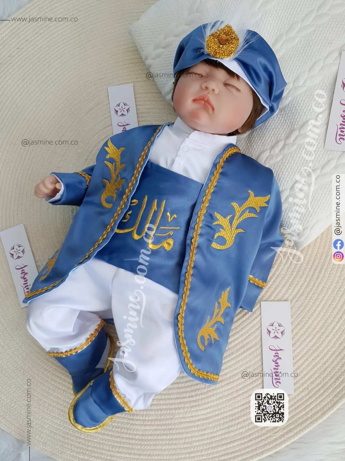 بدلة السلطان مع شوز ذهبي (6 قطع) لون كحلي منور مُصنع بالاسم تصميم تطريز ذهبي غامق sultan Navy baby set name
