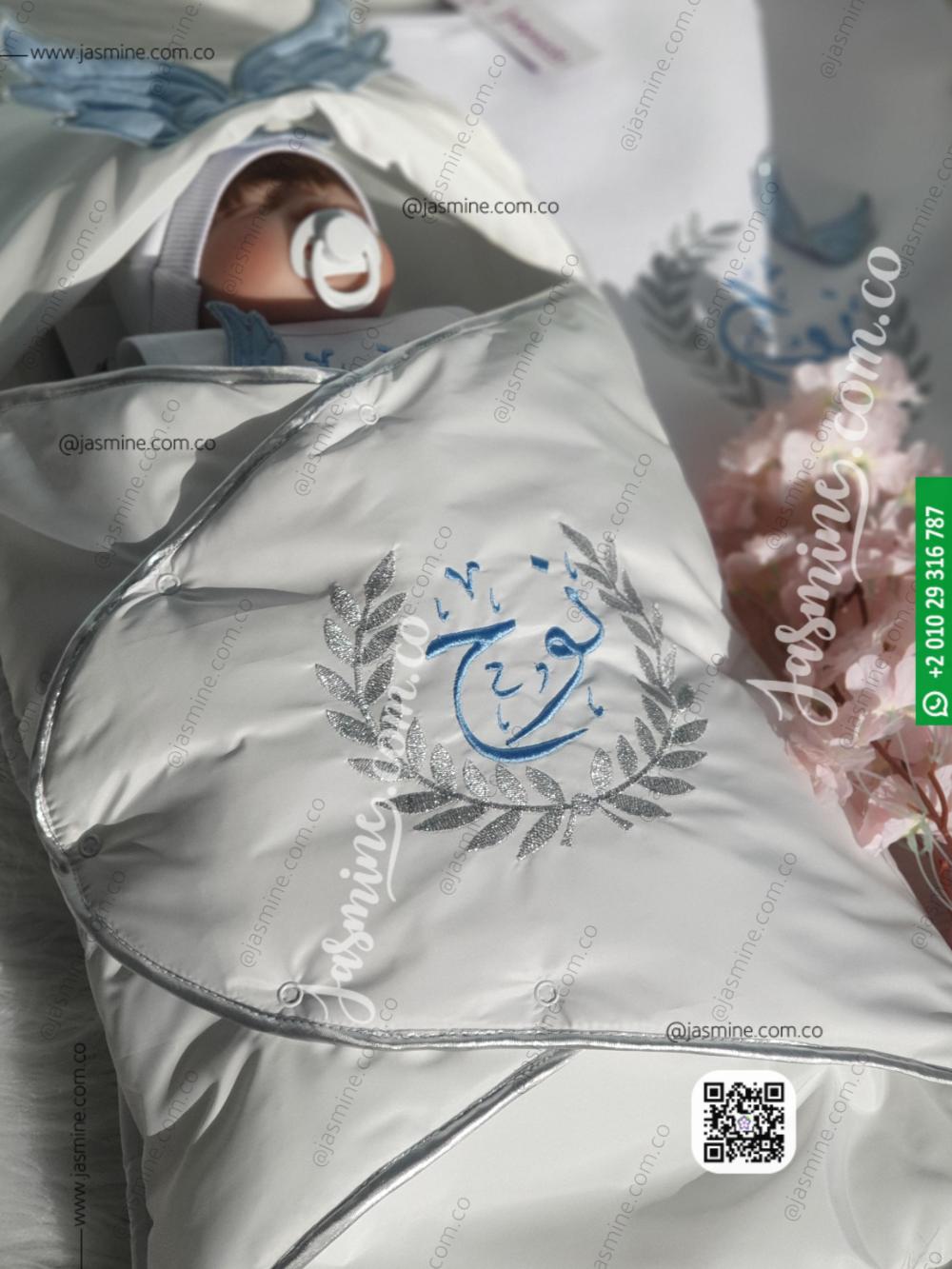 بورت بتصميم تطريز لبني وفضي اسم (نوح Noah) Baby soft sleeping bag wings design