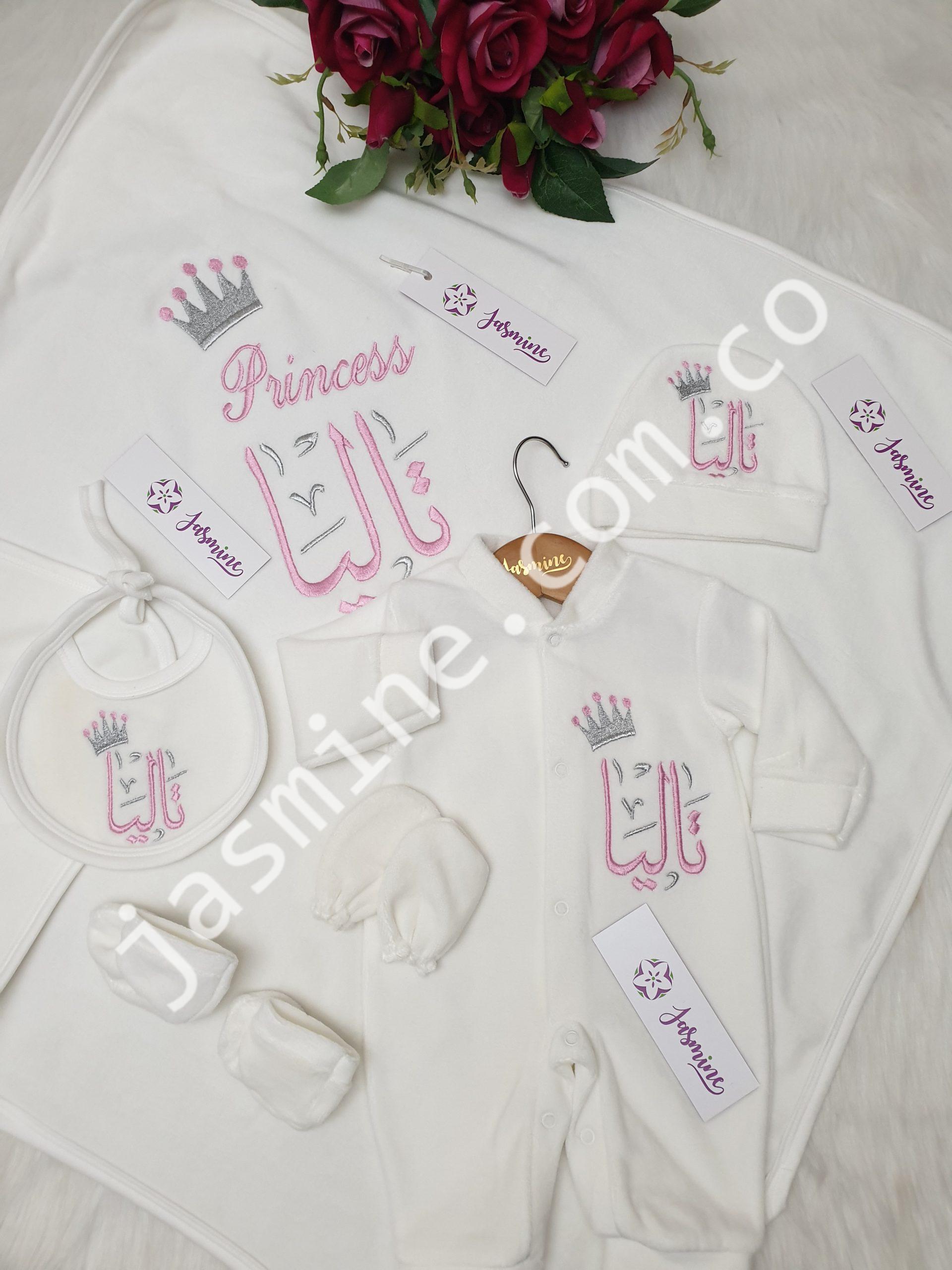 طقم سبوع وولادة ٦ قطع تطريز باسم تاليا Talia