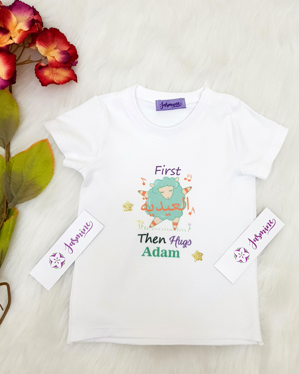 تيشرت نص كم first العيدية then hugs Adam مُصنع بالاسم تيشرت تصميم خروف العيد طباعة