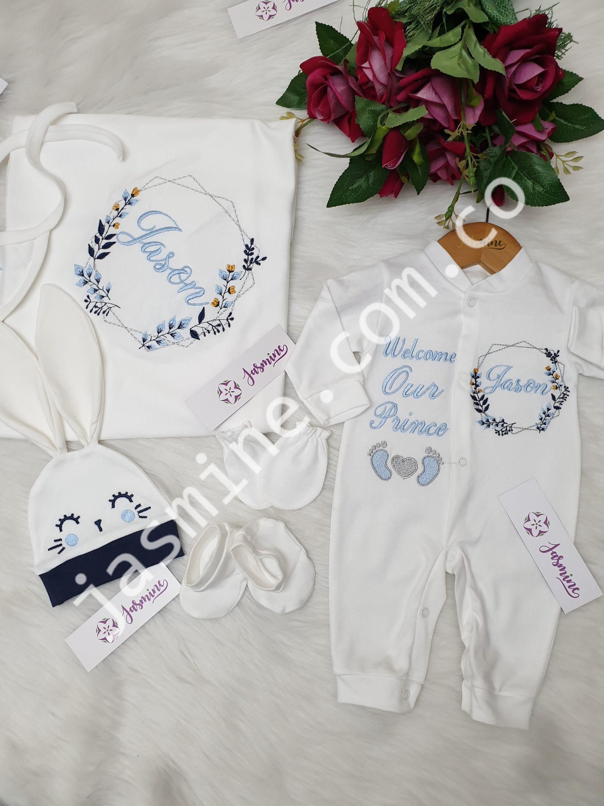 طقم قطن ارنوب للولادة والسبوع تطريز باسم جيسون