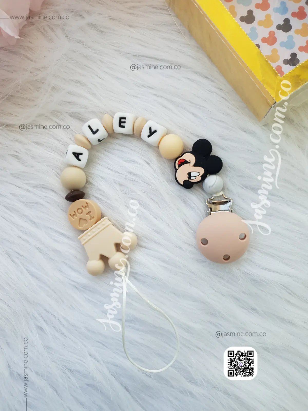 سلسلة سكاتة سيليكون ملونة مع اسم البيبي علي ميكي ماوس (هولدر لهاية سيليكون)