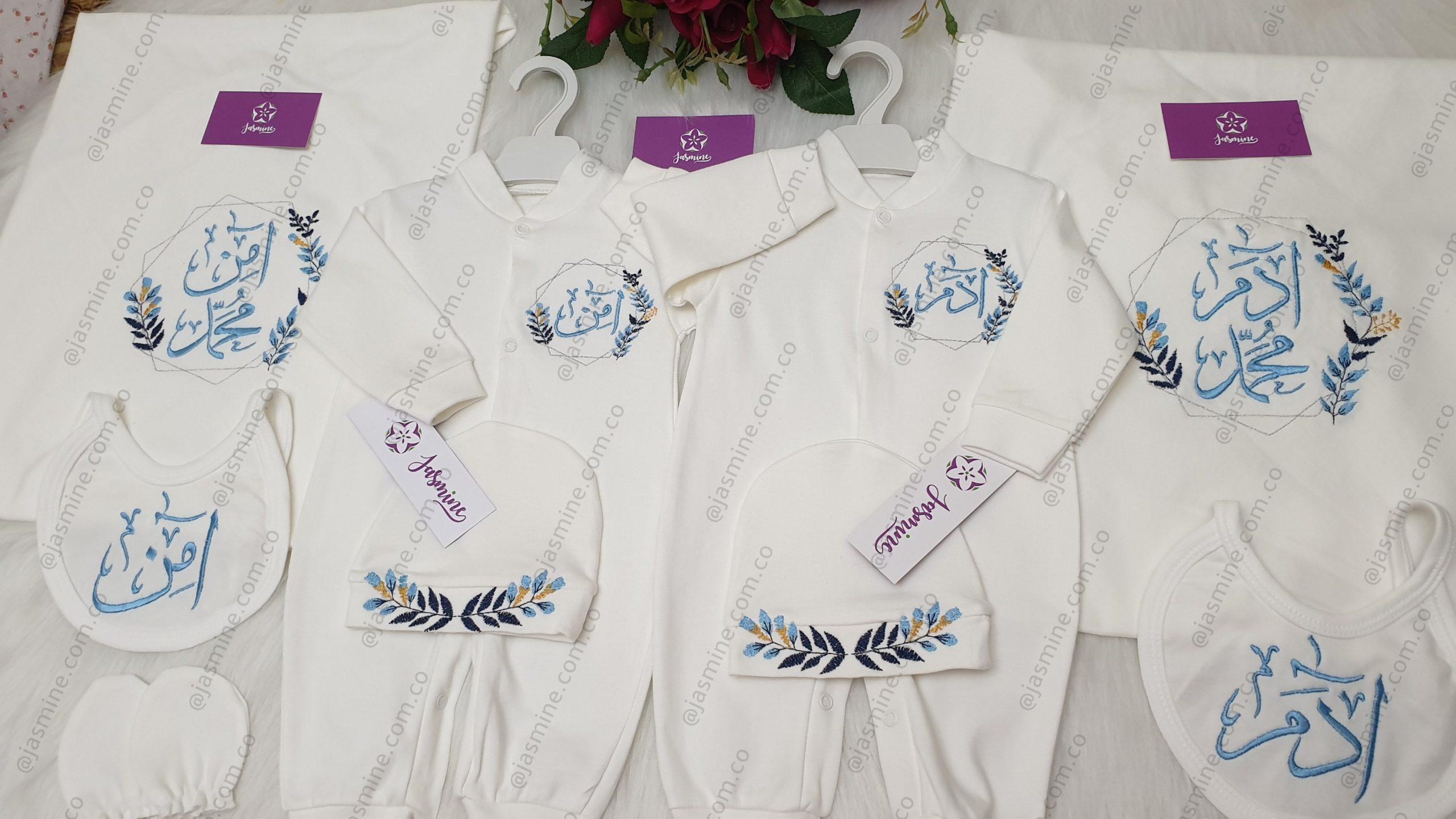 طقمين ولادة توأم كل طقم 6 قطع قطن بيور باسم آدم محمد وآمن محمد وتصميم تطريز مميز