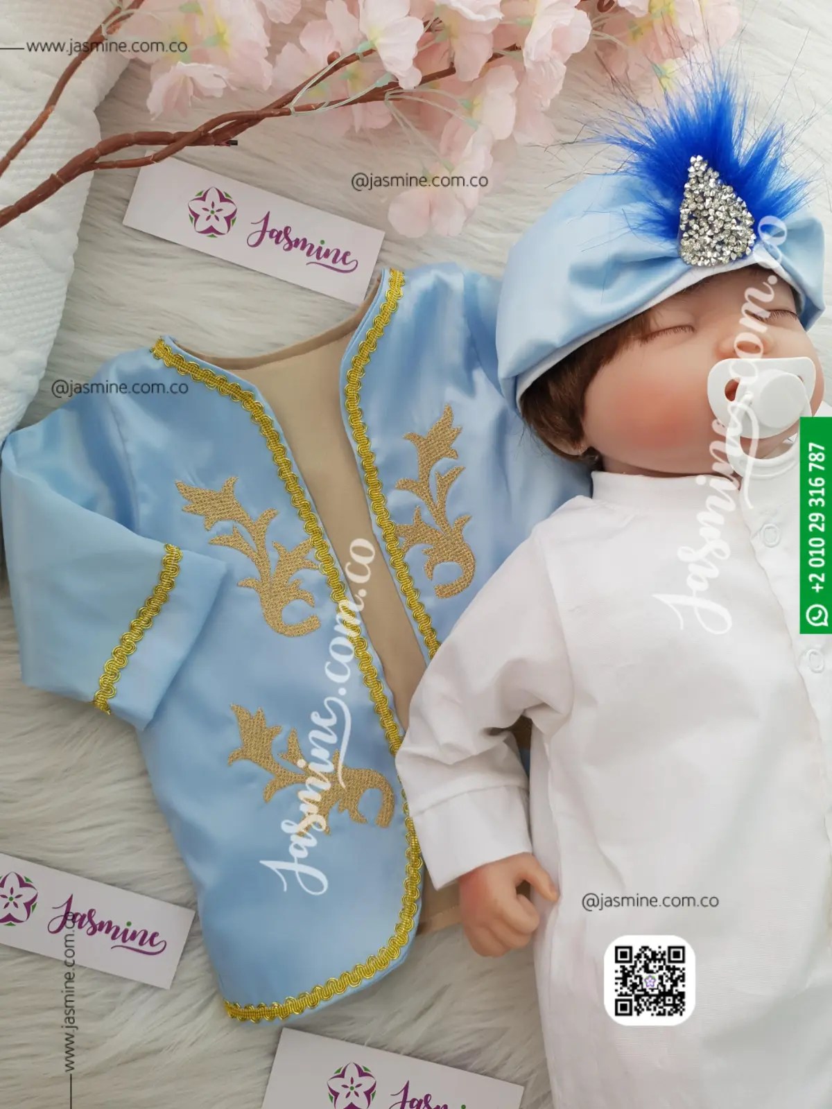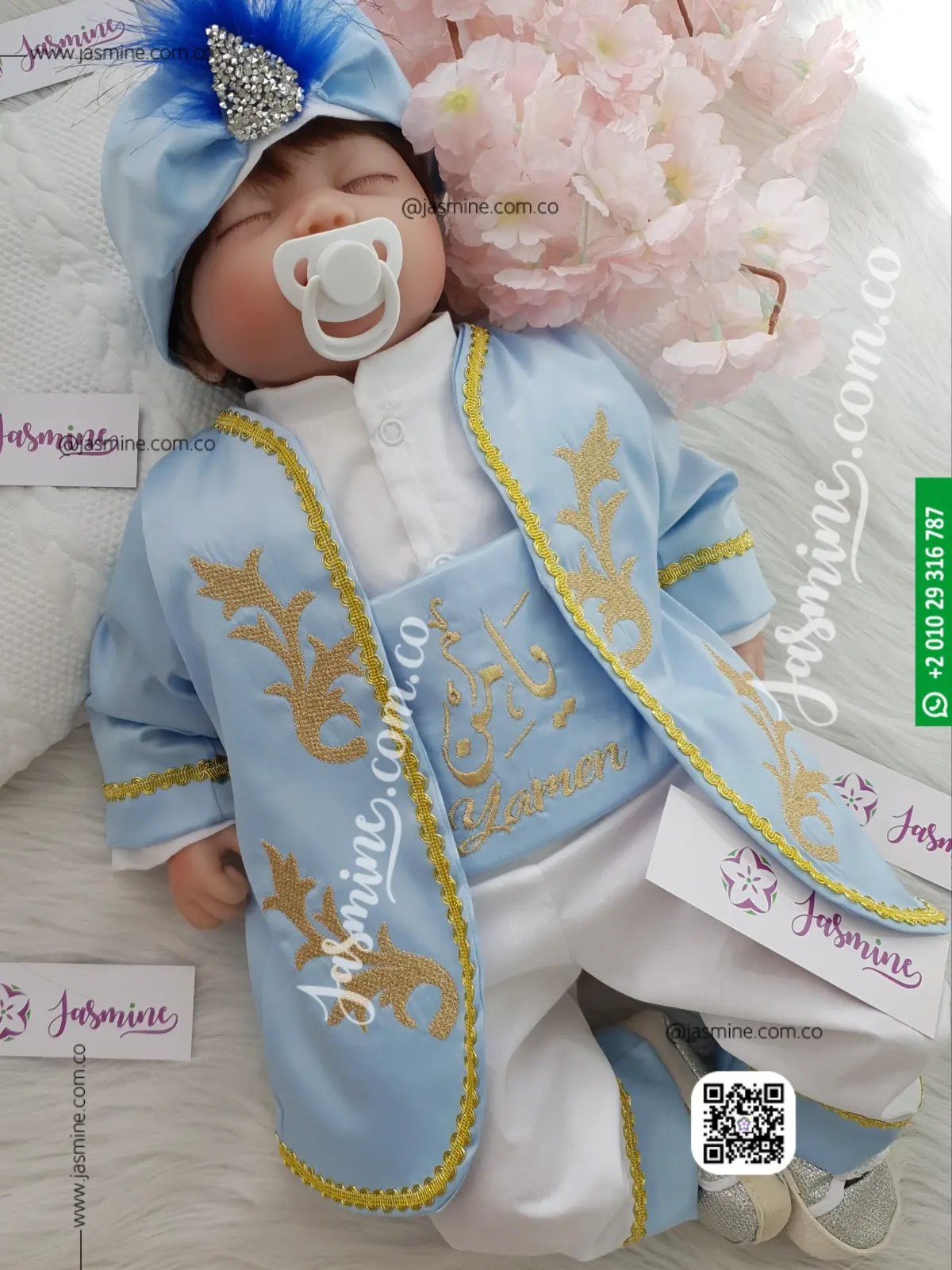 طقم السلطان التركي لون سماوي فاتح لبني مُصنع بالاسم 5 قطع تصميم تطريز ذهبي غامق sultan baby set