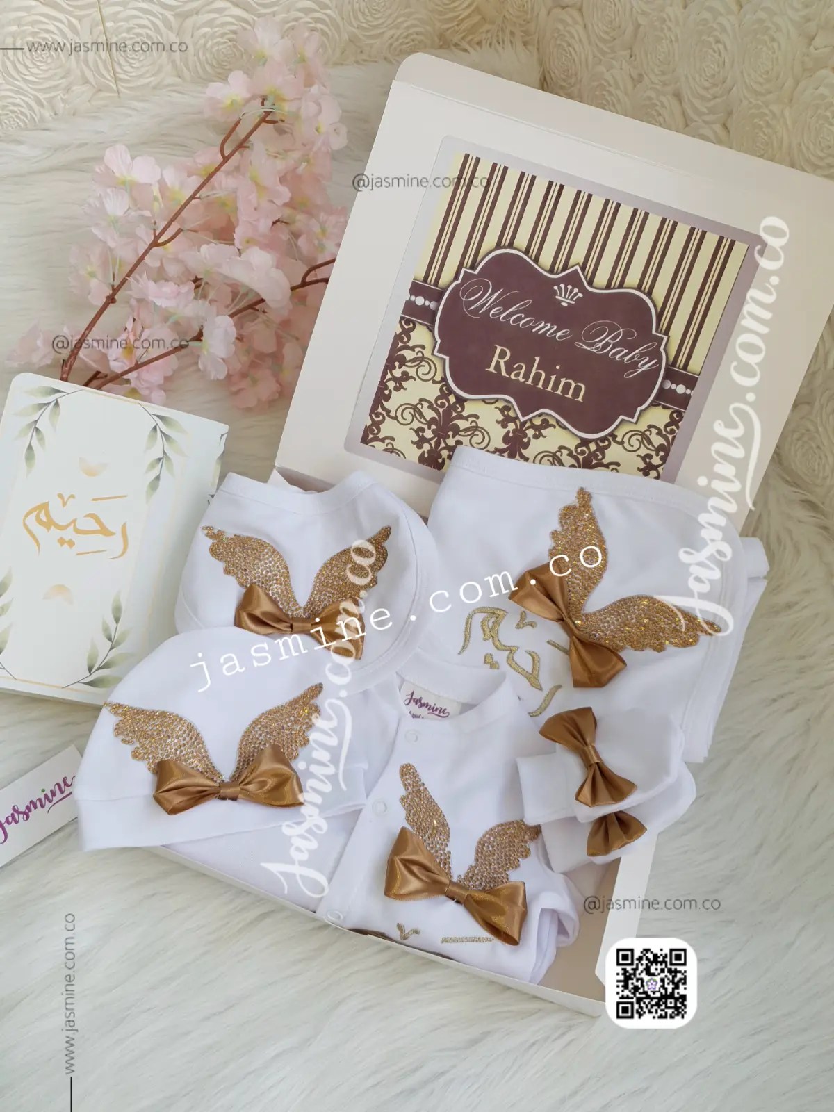 طقم قطن صيفي استقبال مولود تصميم تاج استراس مع فيونكات باسم رحيم لون دهبي 6 قطع