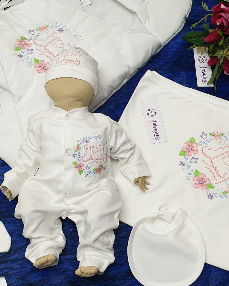 طقم ولادة 6 قطع ايسل ، آيسل صُنعَ بحب بتصميم ورد تطريز ملون