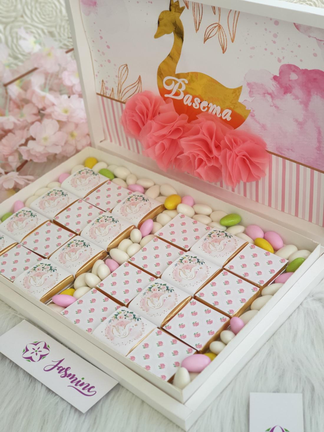 بوكس ملبس لوز فاخر مع 48 قطعة شوكولاتة اسم البيبي ديزاين الأميرة البجعة طباعة للتوزيعات والسبوع وأعياد الميلاد Personalized SWAN PRINCESS Chocolate Box